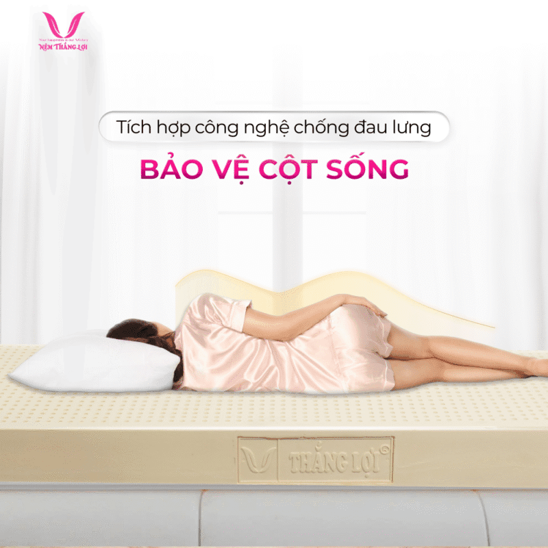 Nệm 100% Cao Su Thiên Nhiên Thắng Lợi SiSi được tích hợp công nghệ chống đau lưng cùng chất liệu cao su thiên nhiên mềm mại, êm ái mang đến cho bạn cảm giác thư giãn tuyệt vời khi nằm. Độ đàn hồi cao của nệm giúp ôm sát từng đường cong của cơ thể, nhất là ở phần cột sống, đảm bảo rằng cột sống luôn được giữ ở vị trí tự nhiên nhất. Điều này không chỉ giúp giảm thiểu áp lực lên cơ thể trong suốt đêm mà còn hỗ trợ trong việc điều trị và phòng ngừa các vấn đề về cột sống, từ cong vẹo cho đến thoát vị đĩa đệm.